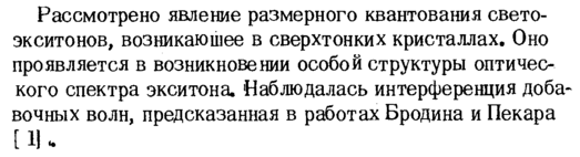 Рассмотрено явление размерного квантования свето-экситонов, возникающее в сверхтонких кристаллах. Оно проявляется в возникновении особой структуры оптического спектра экситона. Наблюдалась интерференция добавочных волн, предсказанная в работах Бродина и Пекара [1U