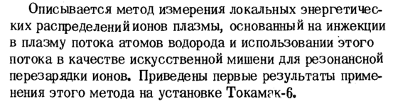 Описывается метод измерения локальных энергетических распределений ионов плазмы, основанный на инжекции в плазму потока атомов водорода и использовании этого потока в качестве искусственной мишени для резонансной перезарядки ионов. Приведены первые результаты применения этого метода на установке Токамрк-6.