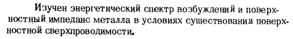 Изучен энергетический спектр возбуждений и поверхностный импеданс металла в условиях существования поверхностной сверхпроводимости.
