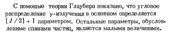 С помощью теории Глаубера показано, что угловое распределение у-излучения в основном определяется [J /2] + 1 параметром. Остальные параметры, обусловленные спинами частиц, являются малыми величинами.
