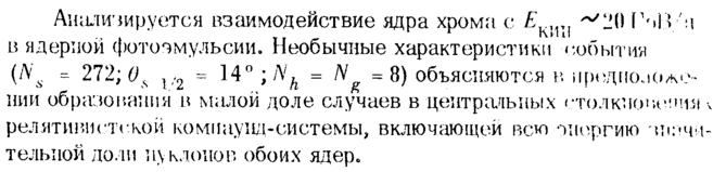 Анализируется взаимодействие ядра хрома с £к,п ^20 Γ·>Β/:ΐ в ядерной фото-эмульсии. Необычные характеристики' 'события (Ns = 272; 0S χ,2 = 14° ; Nh = /V = 8) объясняются в прсдпо.к.ле-1ши образования в малой доле случаев в центральных (-толюклкшия \ релятивистской компаунд-системы, включающей всю энергию зинад-телыюй доли нуклонов обоих ядер.