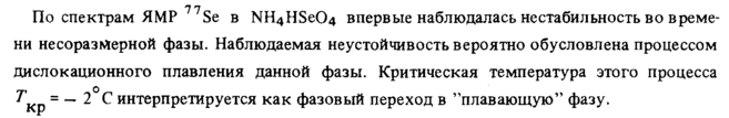 По спектрам ЯМР Se в NH4HSe04 впервые наблюдалась нестабильность во времени несоразмерной фазы. Наблюдаемая неустойчивость вероятно обусловлена процессом дислокационного плавления данной фазы. Критическая температура этого процесса Τ 2°С интерпретируется как фазовый переход в "плавающую" фазу.