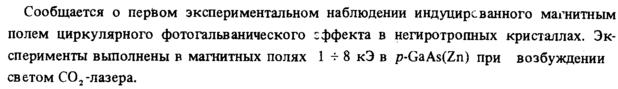 Сообщается о первом экспериментальном наблюдении индуцирсванного магнитным полем циркулярного фото гальванического эффекта в негиротропных кристаллах. Эксперименты выполнены в магнитных полях 1 -г 8 кЭ в p-GaAs(Zn) при возбуждении светом С02-лазера.