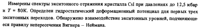 Измерены спектры экситонного отражения кристалла Csl при давлениях до 12,5 кбар и Τ = 8 О К. Определен гидростатический деформационный потенциал для первых трех экситонных переходов. Обнаружено взаимодействие экситонных уровней, подчиняющееся правилу непересечения Вигнера Неймана.
