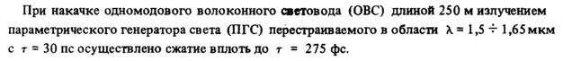 При накачке одномодового волоконного световода (ОВС) длиной 250 м излучением параметрического генератора света (ПГС) перестраиваемого в области λ 1,5 -г 1,65 мкм с г = 30 пс осуществлено сжатие вплоть до τ = 275 фс.