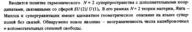 Вводится понятие гармонического N = 2 суперпространства с дополнительными координатами, связанными со сферой SU(2)1 ί/(1). В его рамках УУ = 2 теории материи, Янга -Миллса и супергравитации имеют адекватное геометрическое описание на языке супер-полей без связей. Обнаружено новое явление неограниченность числа калибровочных и вспомогательных степеней свободы.