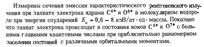 Измерены сечения эмиссии характеристического рентгеновского излучения при захвате электрона ядрами С6+ и 08+ в молекулярном водороде при энергии соударений Ео = 0,6 8 кэВ/ат · ед · марсы. Показано что захват электрона происходит в состояния ионов С5* и О7* с большими главными квантовыми числами при приблизительно равномерном заселении состояний с различными орбитальными моментами.