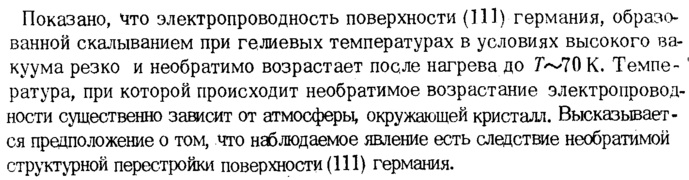 Показано, что электропроводность поверхности (Ш) германия, образ» ванной скалыванием при гелиевых температурах в условиях высокого вакуума резко и необратимо возрастает после нагрева до Г~70 К. Температура, при которой происходит необратимое возрастание электропроводности существенно зависит от атмосферы, окружающей кристалл. Высказывается предположение о том, что наблюдаемое явление есть следствие необратимой структурной перестройки поверхности (111) германия.