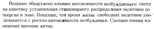 Впервые обнаружено влияние интенсивности возбуждающего света на кинетику установления стационарного распределения экситонов по энергии в зоне. Показано, что время жизни свободных экситонов увеличивается с ростом интенсивности возбуждения. Сделаны оценки изменения времени жизни.
