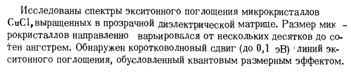 Исследованы спектры экситонного поглощения микрокристаллов CuCl,выращенных в прозрачной диэлектрической матрице. Размер мик -рокристаллов направленно варьировался от нескольких десятков до сотен ангстрем. Обнаружен коротковолновый сдвиг (до 0,1 эВ) 1 линий экситонного поглощения, обусловленный квантовым размерным эффектом.