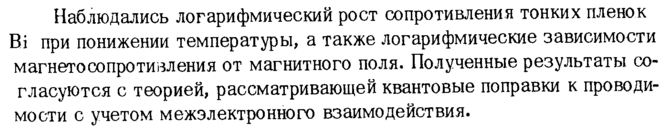 Наблюдались логарифмический рост сопротивления тонких пленок Bi при понижении температуры, а также логарифмические зависимости магнетосопротивления от магнитного поля. Полученные результаты согласуются с теорией, рассматривающей квантовые поправки к проводимости с учетом межэлектронного взаимодействия.