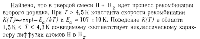 Найдено, что в твердой смеси Η + Н2 идет процесс рекомбинации второго порядка. При Τ > 4,5 К константа скорости рекомбинации К(Т)~ех?(-Еа/кТ) шЕа= 107 ±10 К. Поведение К(Т) в области 1,5 К < Г < 4,3 К по-видимому соответствует неклассическому характеру диффузии атомов Η в Н2.