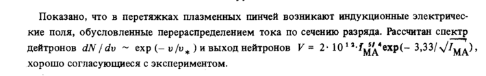 Показано, что в перетяжках плазменных пинчей возникают индукционные электрические поля, обусловленные перераспределением тока по сечению разряда. Рассчитан спектр дейтронов dN / dv ~ ехр (υ /υ # ) и выход нейтронов V2'10 13-/^4ехр(-3,33/>/^д)? хорошо согласующиеся с экспериментом.