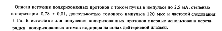Описан источник поляризованных протонов с током пучка в импульсе до 2,5 мА, степенью поляризации 0,78 ± 0,01, длительностью токового импульса 120 мкс и частотой следования 1 Гц. В источнике для получения поляризованных протонов впервые использована перезарядка поляризованных атомов водорода на ионах дейтериевой плазмы.