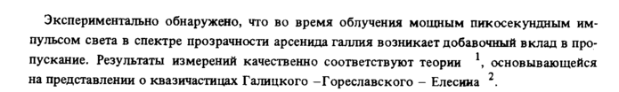 Экспериментально обнаружено, что во время облучения мощным пикосекундным импульсом света в спектре прозрачности арсенида галлия возникает добавочный вклад в пропускание. Результаты измерений качественно соответствуют теории \ основывающейся на представлении о квазичастицах Галицкого -Гореславского Елесина 2.