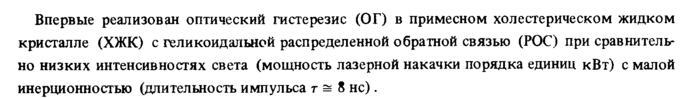 Впервые реализован оптический гистерезис (ОГ) в примесном холестерическом жидком кристалле (ХЖК) с геликоидальной распределенной обратной связью (РОС) при сравнительно низких интенсив но стях света (мощность лазерной накачки порядка единиц кВт) с малой инерционностью (длительность импульса г = 8 не).