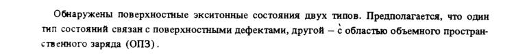 Обнаружены поверхностные экситонные состояния двух типов. Предполагается, что один тип состояний связан с поверхностными дефектами, другой с областью объемного пространственного заряда (ОПЗ).
