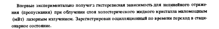 Впервые экспериментально получега гистерезисная зависимость для нелинейного отражения (пропускания) при облучении слоя холестерического жидкого кристалла маломощным (мВт) лазерным излучением. Зарегистрирован осцилляционный по времени переход в стационарное состояние.