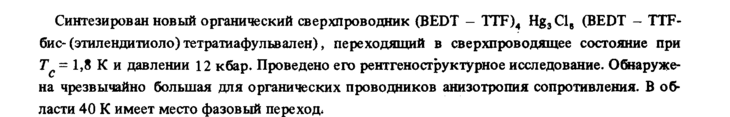 Синтезирован новый органический сверхпроводник (BEDT TTF)4 Hg3ClB (BEDT TTF-бис(этилендитиоло) тетратаафульвален), переходящий в сверхпроводящее состояние при Τс 1,8 К и давлении 12 кбар. Проведено его рентгеноструктурное исследование. Обнаружена чрезвычайно большая для органических проводников анизотропия сопротивления. В области 40 К имеет место фазовый переход*
