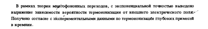 В рамках теории мн^гофононных переходов, с экспоненциальной точностью выведено выражение зависимости вероятности термоионизации от внешнего электрического поля.-" Получено согласие с экспериментальными данными по термоионизацйи глубоких примесей в кремнии.