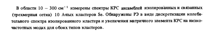 В области 10 300-см"1 измерены спектры КРС ансамблей изолированных и связанных (трехмерная сетка) 10 А-ных кластеров Se. Обнаружены РЭ в виде дискретизации колебательного спектра изолированного кластера и увеличения матричного элемента КРС на низкочастотных модах для обоих типов кластеров.