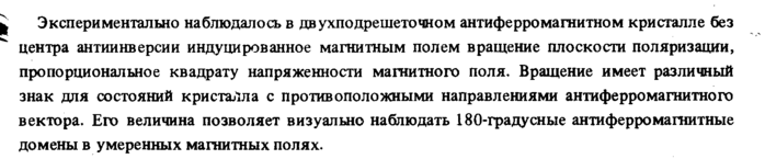 Экспериментально наблюдалось в двухподрешеточном антиферромагнитном кристалле без центра антиинверсии индуцированное магнитным полем вращение плоскости поляризации, пропорциональное квадрату напряженности магнитного поля. Вращение имеет различный знак для состояний кристалла с противоположными направлениями антиферромагнитного вектора. Его величина позволяет визуально наблюдать 180-градусные антиферромагнитные домены в умеренных магнитных полях.