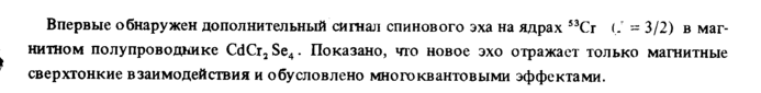 Впервые обнаружен дополнительный сигнал спинового эха на ядрах 53Сг (: =3/2) в магнитном полупроводнике CdCr2 Se4. Показано, что новое эхо отражает только магнитные сверхтонкие взаимодействия и обусловлено много квантовыми эффектами.