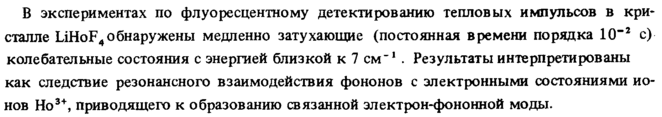 В экспериментах по флуоресцентному детектированию тепловых импульсов в кристалле LiHoF4обнаружены медленно затухающие (постоянная времени порядка 10"2 с) колебательные состояния с энергией близкой к 7 см-1 . Результаты интерпретированы как следствие резонансного взаимодействия фононов с электронными состояниями ионов Но3+, приводящего к образованию связанной электрон-фононной моды.