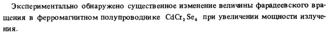 Экспериментально обнаружено существенное изменение величины фарадеевского вращения в ферромагнитном полупроводнике CdCr2Se4 при увеличении мощности излучения.