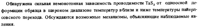 Обнаружена сильная немонотонная зависимость проводимости TaS3 от одноосной деформации образца в широком диапазоне температур вблизи и ниже температуры пайерл-со в с ко го перехода. Обсуждаются возможные механизмы, объясняющие наблюдаемые явления.