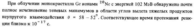 При облучении монокристалла Ge ионами Ne с энергией 102 МэВ обнаружено почти полное исчезновение теневых минимумов в области углов вылета тяжелых продуктов неупругого взаимодействия θ = 58 52 . Соответствующее время протекания реакции близко к 10" 17 с.