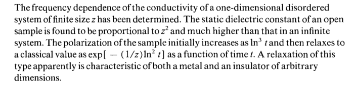 The frequency dependence of the conductivity of a one-dimensional disordered system of finite size ζ has been determined. The static dielectric constant of an open sample is found to be proportional to z2 and much higher than that in an infinite system. The polarization of the sample initially increases as In3 t and then relaxes to a classical value as exp [ — (l/z)ln21] as a function of time t. A relaxation of this type apparently is characteristic of both a metal and an insulator of arbitrary dimensions.