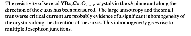 The resistivity of several YBa2Cu307 _ x crystals in the ab plane and along the direction of the с axis has been measured. The large anisotropy and the small transverse critical current are probably evidence of a significant inhomogeneity of the crystals along the direction of the с axis. This inhomogeneity gives rise to multiple Josephson junctions.