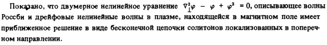 Покарано, что двумерное нелинейное уравнение V^y> φ + φ2 = 0, описывающее волны Росс б и и дрейфовые нелинейные волны в плазме, находящейся в магнитном поле имеет приближенное решение в виде бесконечной цепочки солитоНов локализованных в поперечном направлении.