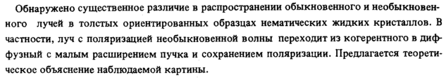 Обнаружено существенное различие в распространении обыкновенного и необыкновенного лучей в толстых ориентированных образцах нематических жидких кристаллов. В частности, луч с поляризацией необыкновенной волны переходит из когерентного в диффузный с малым расширением пучка и сохранением поляризации. Предлагается теоретическое объяснение наблюдаемой картины.