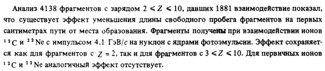 Анализ 4138 фрагментов с зарядом 2 < Ζ < 10, давших 1881 взаимодействие показал, что существует эффект уменьшения длины свободного пробега фрагментов на первых сантиметрах пути от места образования. Фрагменты получены при взаимодействии ионов 12 С и 2 2 Ne с импульсом 4,1 ГэВ/с на нуклон с ядрами фотоэмульсии. Эффект сохраняется как для фрагментов с /=2, так и для фрагментов с 3 <Z < 10. Для первичных ионов 12 С и 2 2 Ne аналогичный эффект отсутствует.
