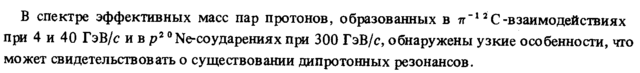 В спектре эффективных масс пар протонов, образованных в π"12 С -взаимодействиях при 4 и 40 ГэВ/с ивр20 Ne-со ударения χ при 300 ГэВ/с, обнаружены узкие особенности, что может свидетельствовать о существовании дипротонных резонансов.