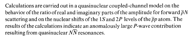 Calculations are carried out in a quasinuclear coupled-channel model on the behavior of the ratio of real and imaginary parts of the amplitude for forward pN scattering and on the nuclear shifts of the \S and IP levels of the/?/? atom. The results of the calculations indicate an anomalously large P-wave contribution resulting from quasinuclear NN resonances.