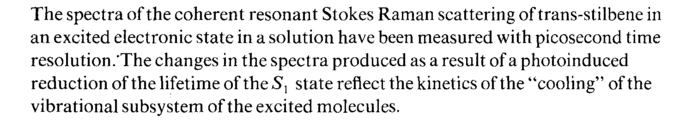 The spectra of the coherent resonant Stokes Raman scattering of trans-stilbene in an excited electronic state in a solution have been measured with picosecond time resolution/The changes in the spectra produced as a result of a photoinduced reduction of the lifetime of the Sx state reflect the kinetics of the "cooling" of the vibrational subsystem of the excited molecules.
