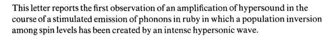 This letter reports the first observation of an amplification of hypersound in the course of a stimulated emission of phonons in ruby in which a population inversion among spin levels has been created by an intense hypersonic wave.