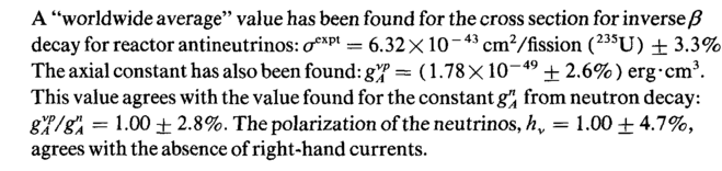 A "worldwide average" value has been found for the cross section for inverse β decay for reactor antineutrinos: σ6*1* = 6.32 X 10~43 cmVfission (235U) ± 3.3% The axial constant has also been found: gv/ = (1.78 Χ 1G~49 ± 2,6%) erg · cm3. This value agrees with the value found for the constant gnA from neutron decay: gJ/gA = 100 ± 2.8%. The polarization of the neutrinos, hv = 1,00 ± 4.7%, agrees with the absence of right-hand currents.