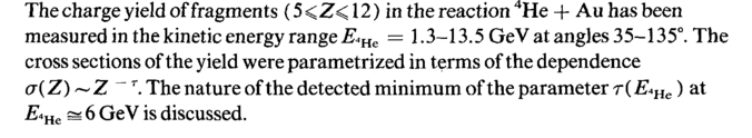 The charge yield of fragments (5 <Z< 12) in the reaction 4He 4Au has been measured in the kinetic energy range 2£«He = 1.3-13.5 GeV at angles 35-135°. The cross sections of the yield were parametrized in terms of the dependence σ(Ζ) ~ Ζ ~~r. The nature of the detected minimum of the parameter r(E4He) at Еагг, & 6 GeV is discussed.