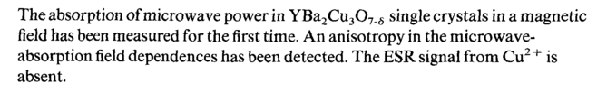 The absorption of microwave power in YBa2Cu307„6 single crystals in a magnetic field has been measured for the first time. An anisotropy in the microwave-absorption field dependences has been detected. The ESR signal from Cu2+ is absent.