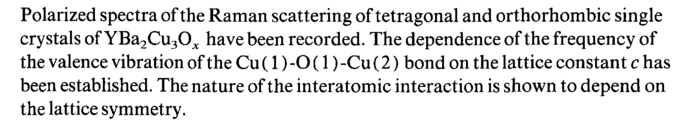 Polarized spectra of the Raman scattering of tetragonal and orthorhombic single crystals of õ÷Á2óÉ3ïÌ have been recorded. The dependence of the frequency of the valence vibration of the Cu (1) -O (1) -Cu (2) bond on the lattice constant Ó has been established. The nature of the interatomic interaction is shown to depend on the lattice symmetry.