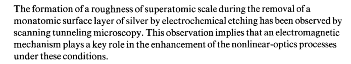 The formation of a roughness of superatomic scale during the removal of a monatomic surface layer of silver by electrochemical etching has been observed by scanning tunneling microscopy. This observation implies that an electromagnetic mechanism plays a key role in the enhancement of the nonlinear-optics processes under these conditions.