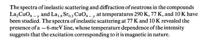 The spectra of inelastic scattering and diffraction of neutrons in the compounds La2Cu04 _ y and LaL8 Sr0 2 Cu04 _ y at temperatures 290 K, 77 K, and 10 К have been studied. The spectra of inelastic scattering at 77 К and 10 К revealed the presence of a — 6-meV line, whose temperature dependence of the intensity suggests that the excitation corresponding to it is magnetic in nature.
