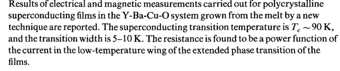 Results of electrical and magnetic measurements carried out lor polycrystailine superconducting films in the Y-Ba-Cu-O system grown from the melt by a new technique are reported. The superconducting transition temperature is Tc ~ 90 K, and the transition width is 5-10 K. The resistance is found to be a power function of the current in the low-temperature wing of the extended phase transition of the films.
