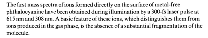 The first mass spectra of ions formed directly on the surface of metal-free phthalocyanine have been obtained during illumination by a 300-fs laser pulse at 615 nm and 308 nm. A basic feature of these ions, which distinguishes them from ions produced in the gas phase, is the absence of a substantial fragmentation of the molecule.