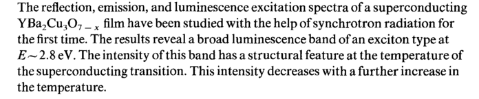 The reflection, emission, and luminescence excitation spectra of a superconducting YBa2Cu307 _ x film have been studied with the help of synchrotron radiation for the first time. The results reveal a broad luminescence band of an exciton type at £"—2.8 eV. The intensity of this band has a structural feature at the temperature of the superconducting transition. This intensity decreases with a further increase in the temperature.