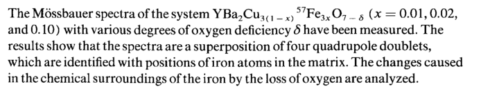 The Mossbauer spectra of the system YBa2Cu3(1 _x) 57Fe3xO? _ δ (χ = 0.01,0.02, and 0.10) with various degrees of oxygen deficiency δ have been measured. The results show that the spectra are a superposition of four quadrupole doublets, which are identified with positions of iron atoms in the matrix. The changes caused in the chemical surroundings of the iron by the loss of oxygen are analyzed.
